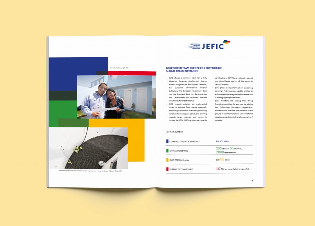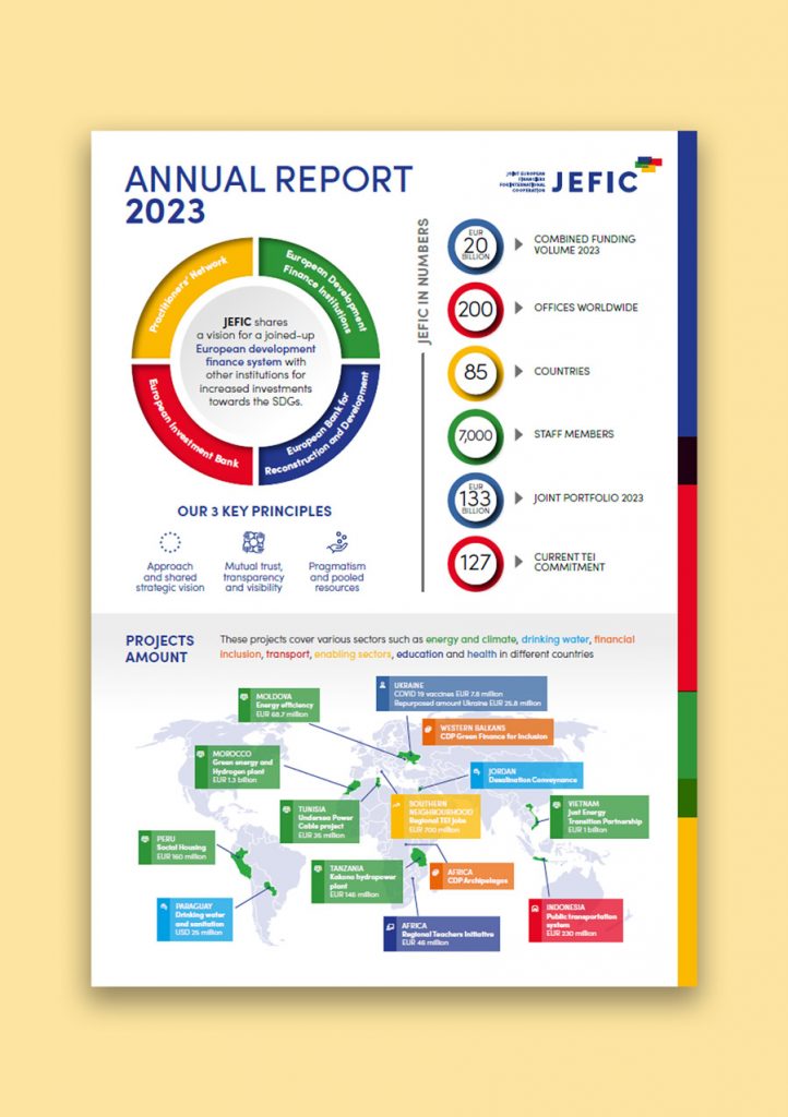 Además como parte del proyecto de diseño editorial para el Informe Anual 2023, desarrollamos una infografía visualmente atractiva y dinámica que resume los principales datos y logros de JEFIC (Joint European Financing Institutions for Cooperation).